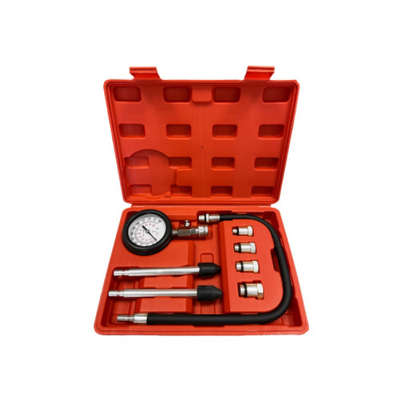 Состоит из большого манометра с легко читаемой шкалой и клапана сброса давления, прямой и изогнутой стальных трубок с резиновыми конусными насадками, гибкого резинового шланга с резьбовым наконечником М14*1.25 и переходников с резьбами: М10*1.0, М12*1.25, М18*1.5.